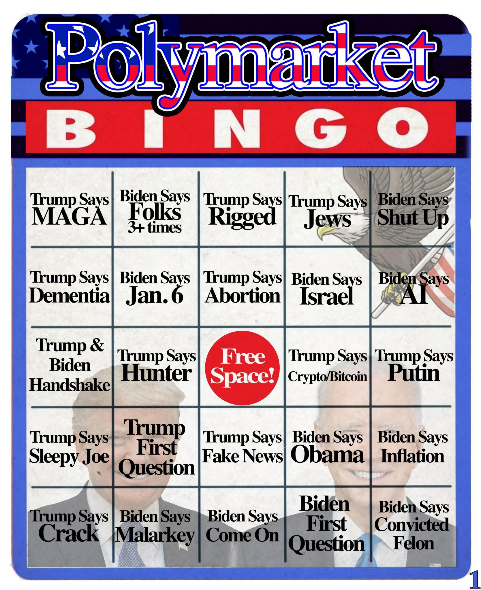 This market is over bingo card 1 for the US Presidential debate scheduled for June 27. Each square on the bingo card is associated with a Polymarket event on the debate. You can find the bingo card here: https://polymarket-upload.s3.us-east-2.amazonaws.com/debatebingo1.jpeg