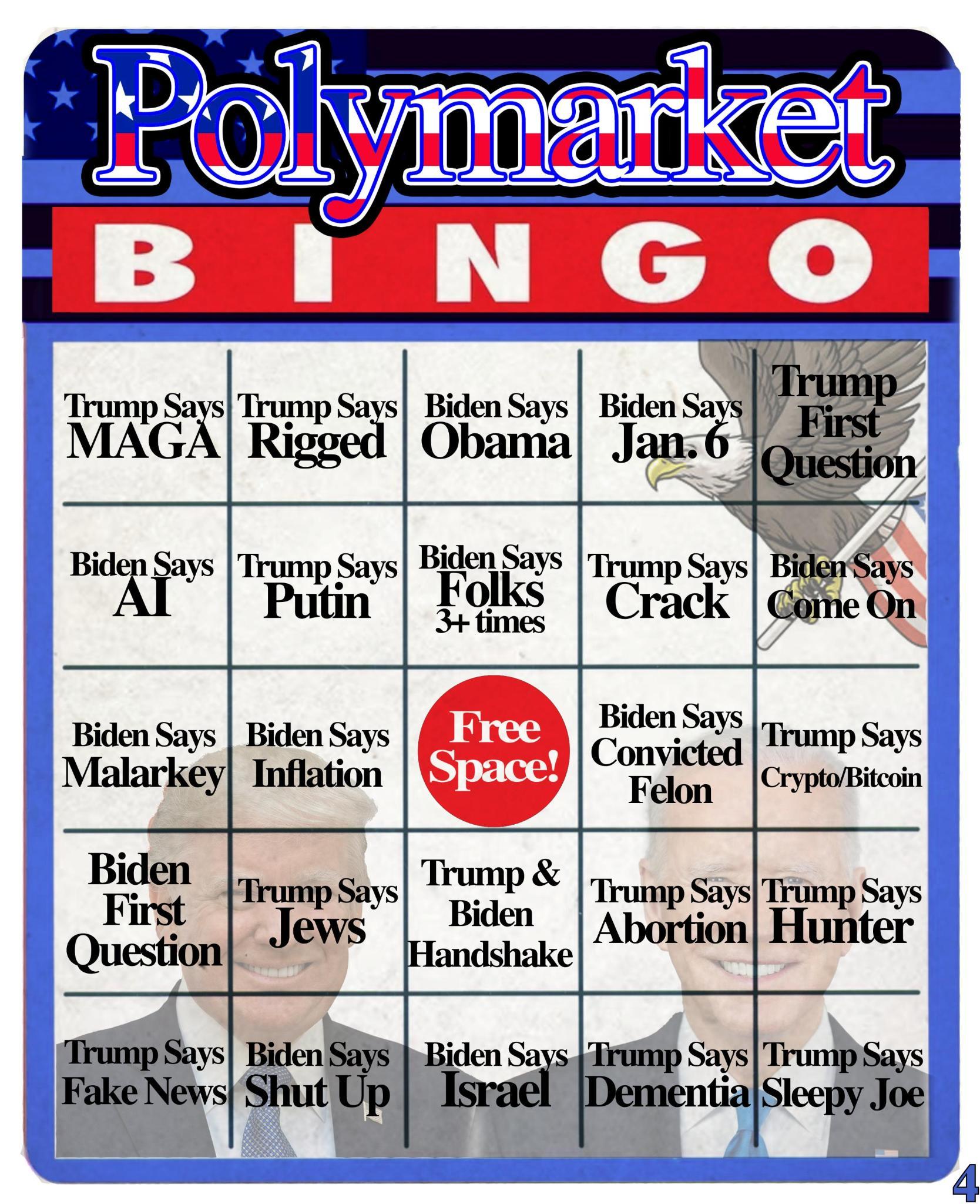 This market is over bingo card 4 for the US Presidential debate scheduled for June 27. Each square on the bingo card is associated with a Polymarket event on the debate. You can find the bingo card here: https://polymarket-upload.s3.us-east-2.amazonaws.com/debatebingo4.jpeg