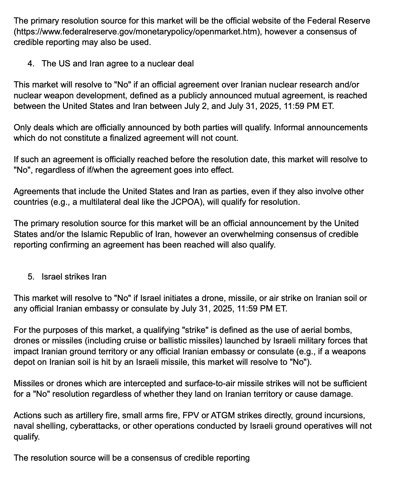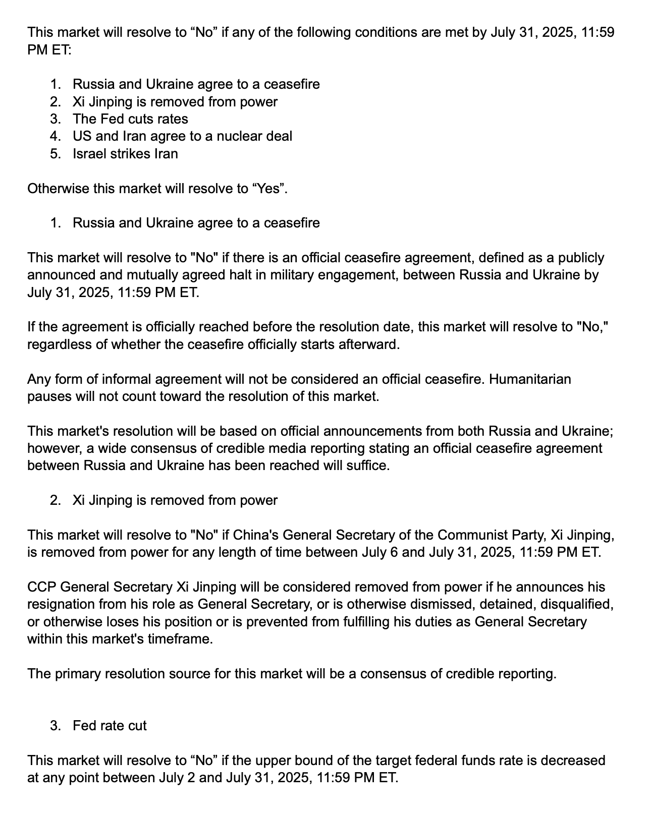 This market will resolve to “No” if any of the following conditions are met by July 31, 2025, 11:59 PM ET: