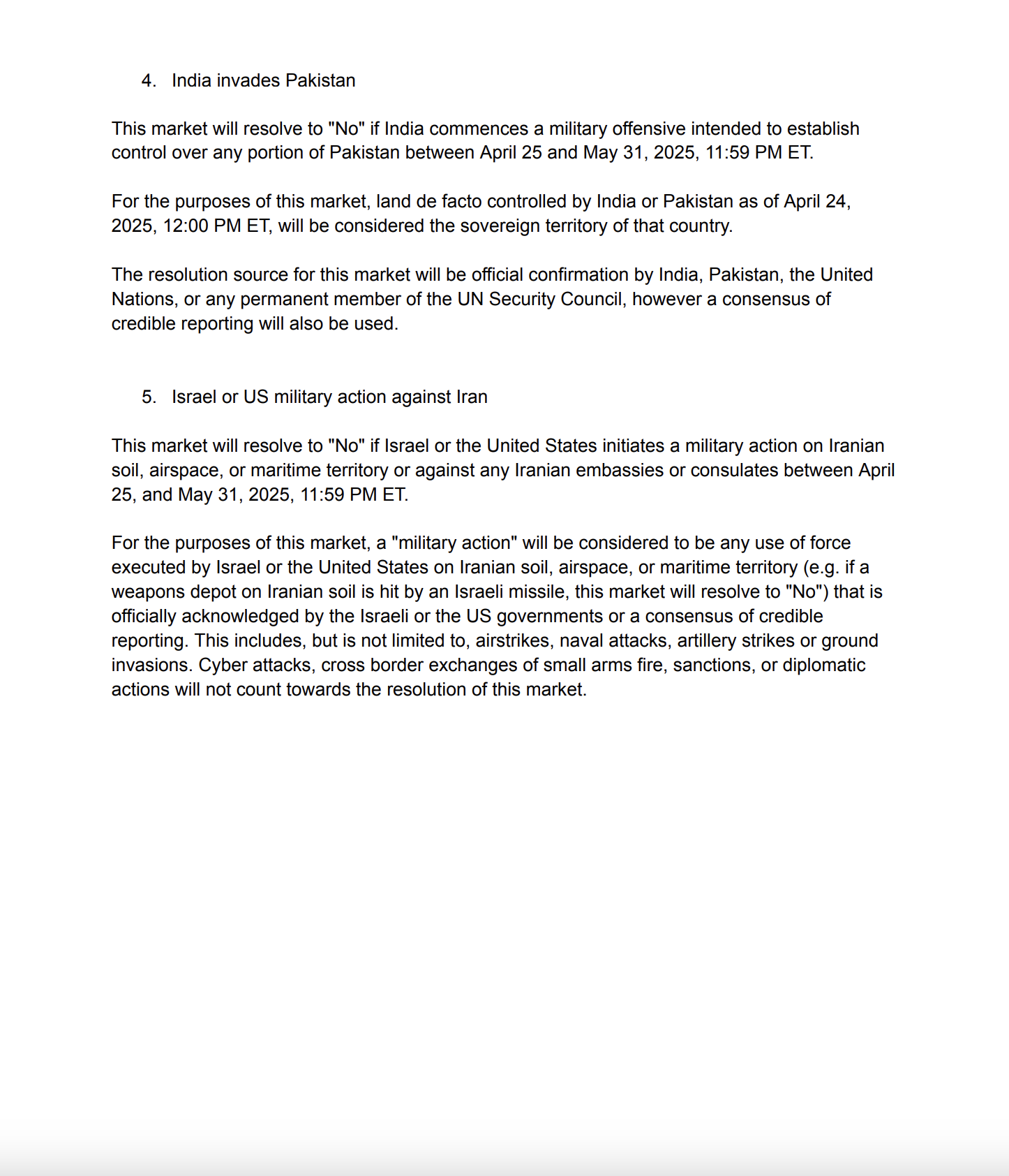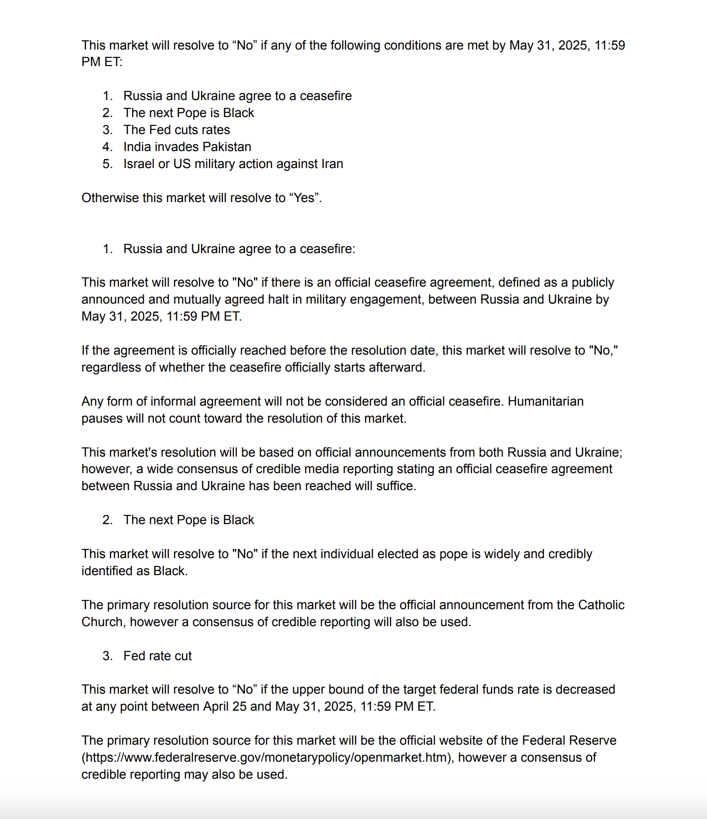 This market will resolve to “No” if any of the following conditions are met by May 31, 2025, 11:59 PM ET: